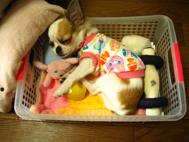 タオルを敷いて、おもちゃを放り込んでおきました。