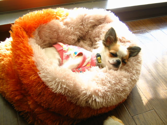 陽がさしたところが温まると、ここにベッドを移動して朝寝。